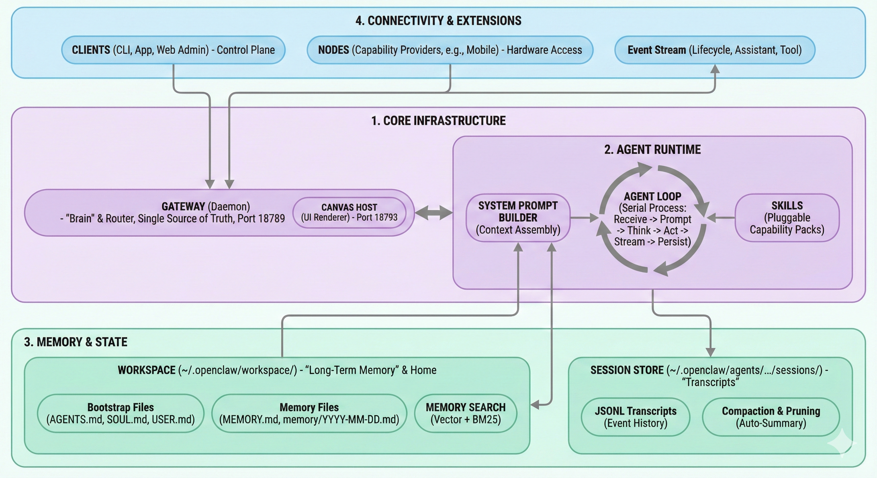 這篇筆記將 OpenClaw 架構整理成四個層級:Core Infrastructure、Agent Runtime、Memory & State、Connectivity & Extensions。