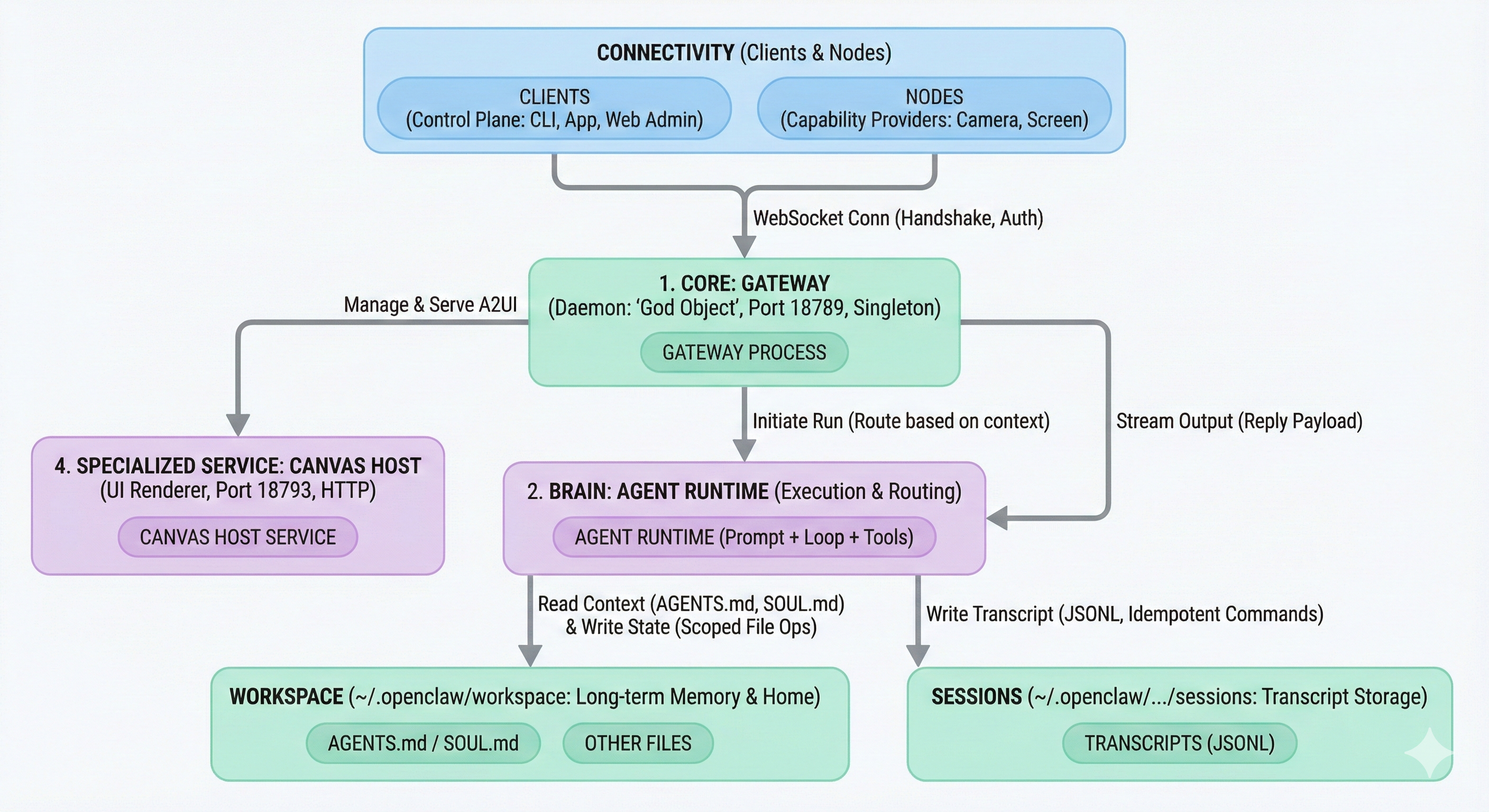Gateway 是中央主機與路由器,Agent Runtime 是執行大腦,Memory & State 是持久化層(Workspace + Sessions),而 Clients / Nodes 則是透過 Gateway 連入的外部控制與能力端點。