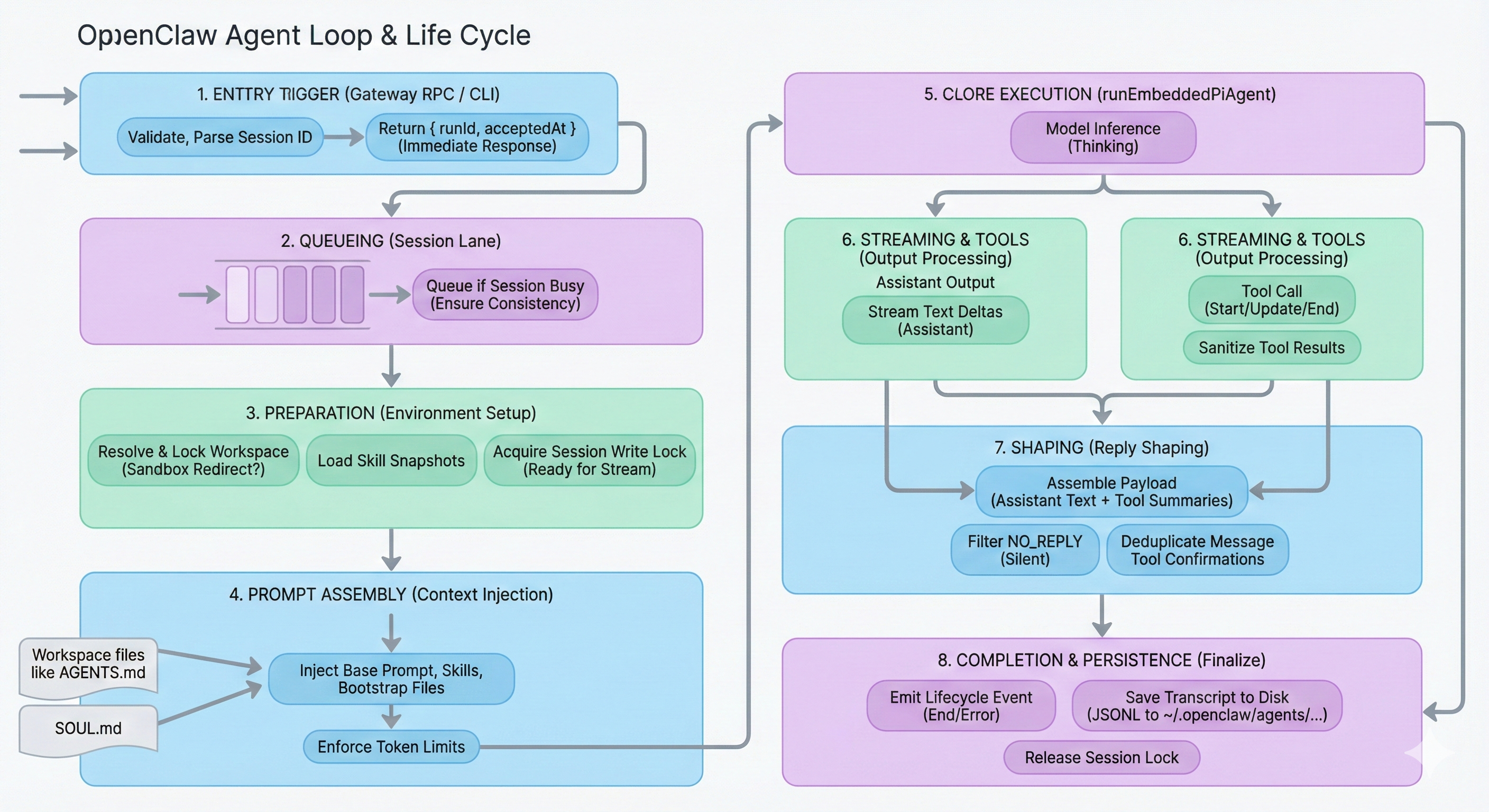 總覽:這張圖展示 OpenClaw Agent Loop Lifecycle 的 8 個連續階段。從 Entry & Initialization(Gateway RPC/CLI 驗證、Session 解析、Metadata 持久化、立即回傳 { runId, acceptedAt })開始,接著是依 Session Key 進行的 Queueing & Serialization。然後準備 Session & Workspace,組裝 System Prompt(Base Prompt、Skill Prompts、Bootstrap Context、Overrides、Token Reserve),執行 Execution Loop & Streaming(Assistant Deltas + Tool Events,搭配 Tool Sanitization),套用 Reply Shaping(NO_REPLY 過濾與去重),遇到 Context 溢位時可能進入 Compaction & Retries,最後到達 Completion & Persistence(Lifecycle End/Error、Transcript 持久化、Timeout/Abort 處理、最終 Client 狀態)。