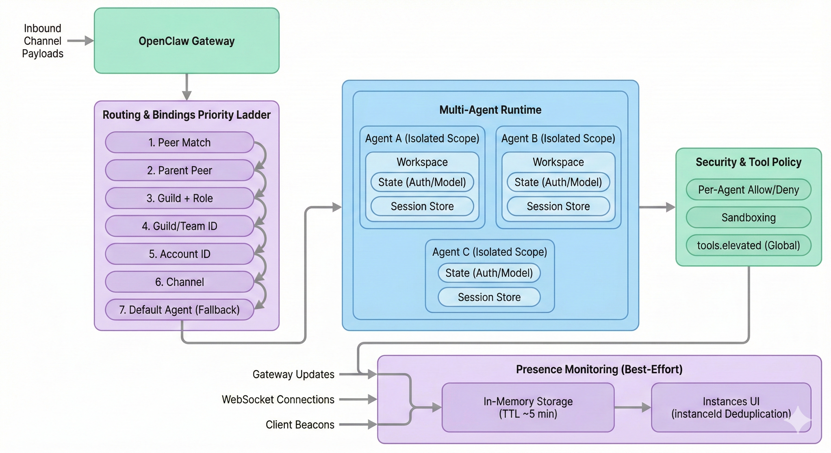 Overview: this diagram shows one OpenClaw Gateway receiving inbound channel payloads, applying a deterministic Routing & Bindings priority ladder (Peer → Parent Peer → Guild+Role → Guild/Team → Account → Channel → Fallback), and selecting an agentId. The selected agent runs in an isolated scope (workspace, state directory with auth/model registries, and session store), then executes tools under a security check with per-agent allow/deny policy (while tools.elevated remains global). The lower lane shows Presence as best-effort in-memory monitoring fed by gateway/WebSocket/beacon updates, pruned after TTL (~5 minutes), and displayed in the macOS Instances UI with instanceId-based deduplication.